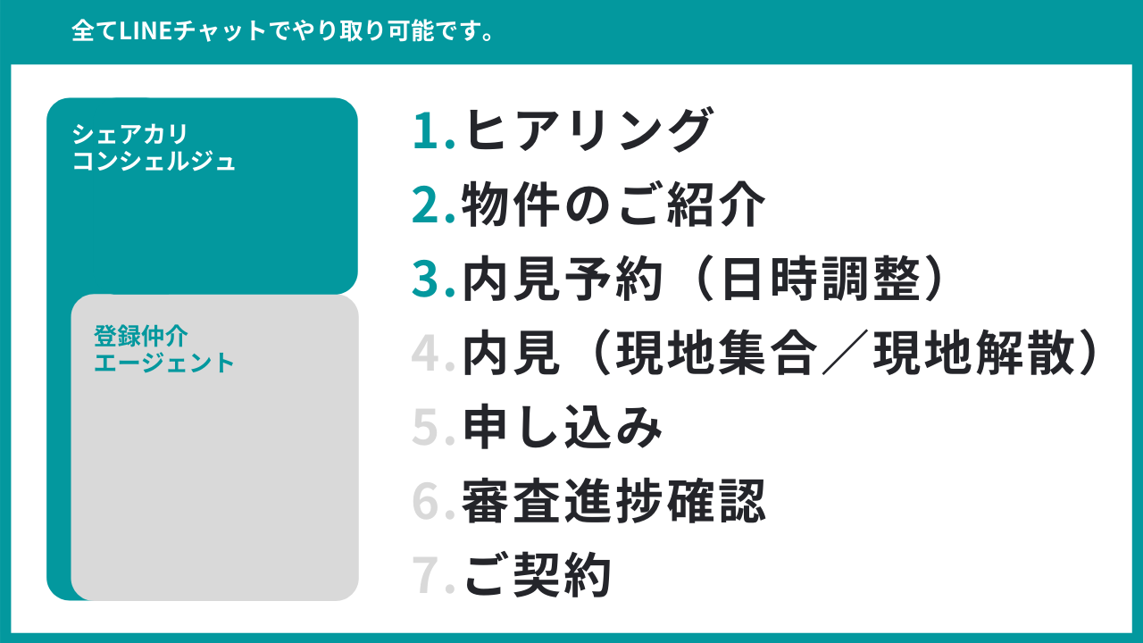内見以降はシェアカリに登録をしている仲介エージェントとマッチングいたします。店舗来店などは一切なく、物件最寄駅もしくは物件前にてエージェントと待ち合わせをして内見を行います。